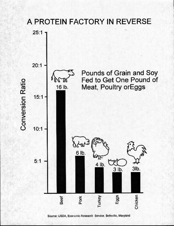 (Source: Roller, W.L. et al, “Energy Costs of Intensive Livestock Production,” American Society of Agricultural Engineers, June 1975, St. Joseph, Michigan, paper no. 75-4042, table 7, page 14, cited in Singer and Mason, Animal Factories, note 54. Also in John Robbins, Diet For A New America, page 376.)
