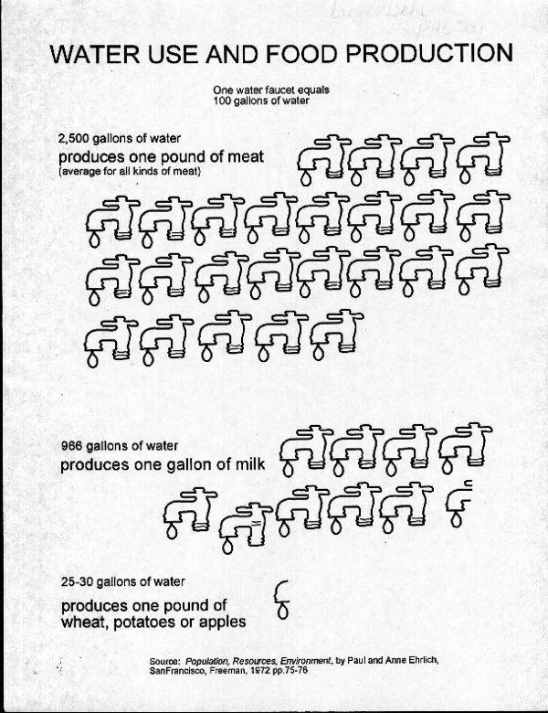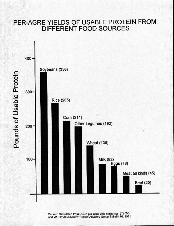 (Source: David and Marcia Pimental, Food, Energy, and Society, London: Edward Arnold, 1979, page 59; David Pimental, et al, “Energy and Land Constraints in Food Protein Production,” Science, 21, November 1975.)